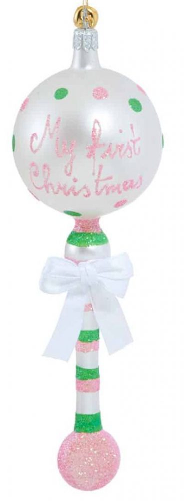 Mouth Blown, Hand Painted, Decorated and Glittered in Italy Free Blown Italian Glass Keepsake Baby Girl First Christmas Ornament Hand Painted Pink and Green Glitter Dot Baby’s First Christmas Rattle Ornament Shake baby rattle to create a rattling noise! 7″ Tall