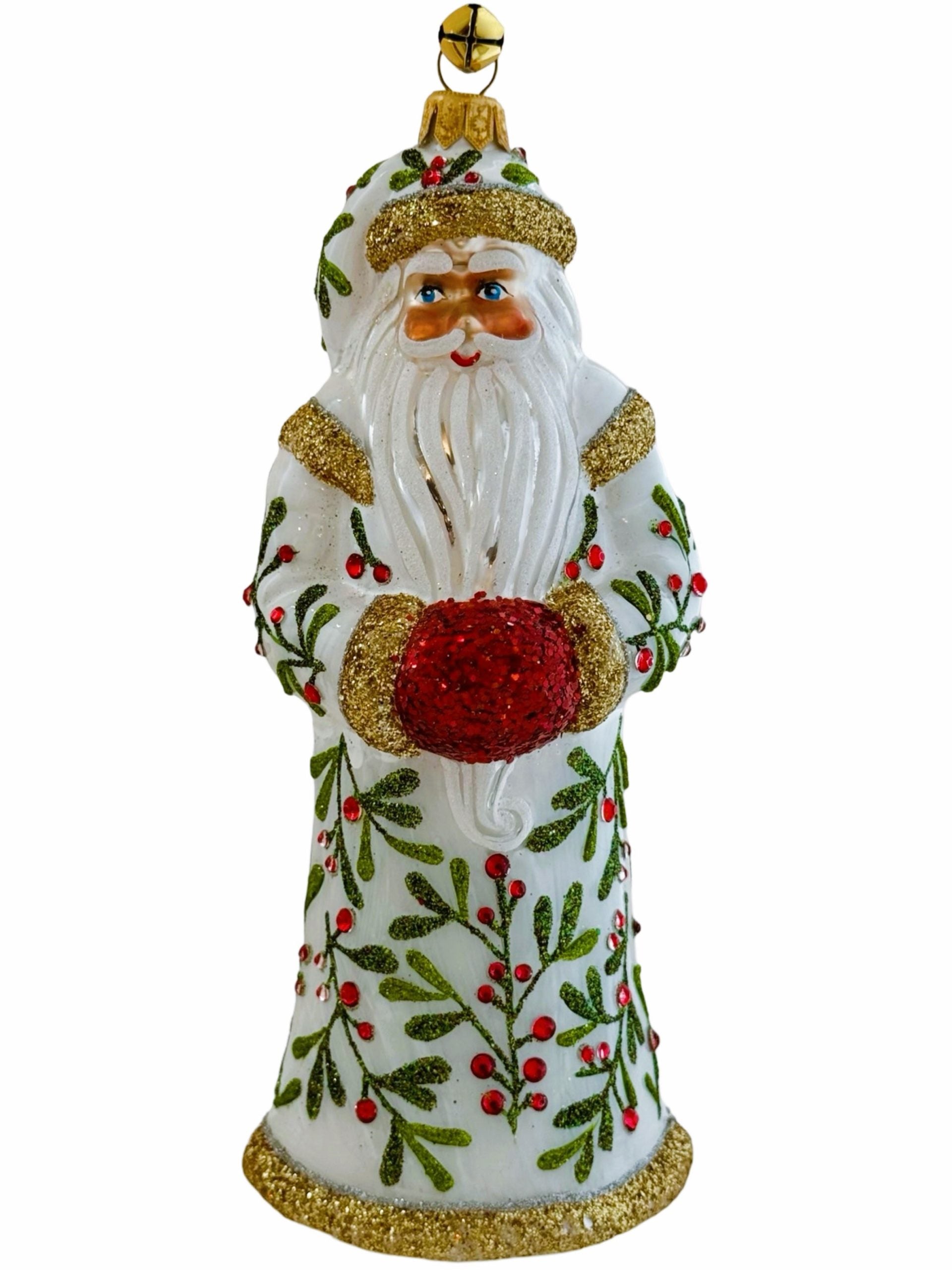 Mouth Blown, Hand Painted and Glittered in Poland Sterling Silver Lined Hand Blown Glass Santa Claus Christmas Tree Ornament Special Limited Edition Hand Painted Green and Red Glitter Holiday Holly Berry Floral Patterned White Coat Santa Claus Ornament with Red Glitter Muffs Unique Collectible Keepsake Holiday Décor Santa Ornament Trimmed with Czech Crystals and Gold Tassel 7″